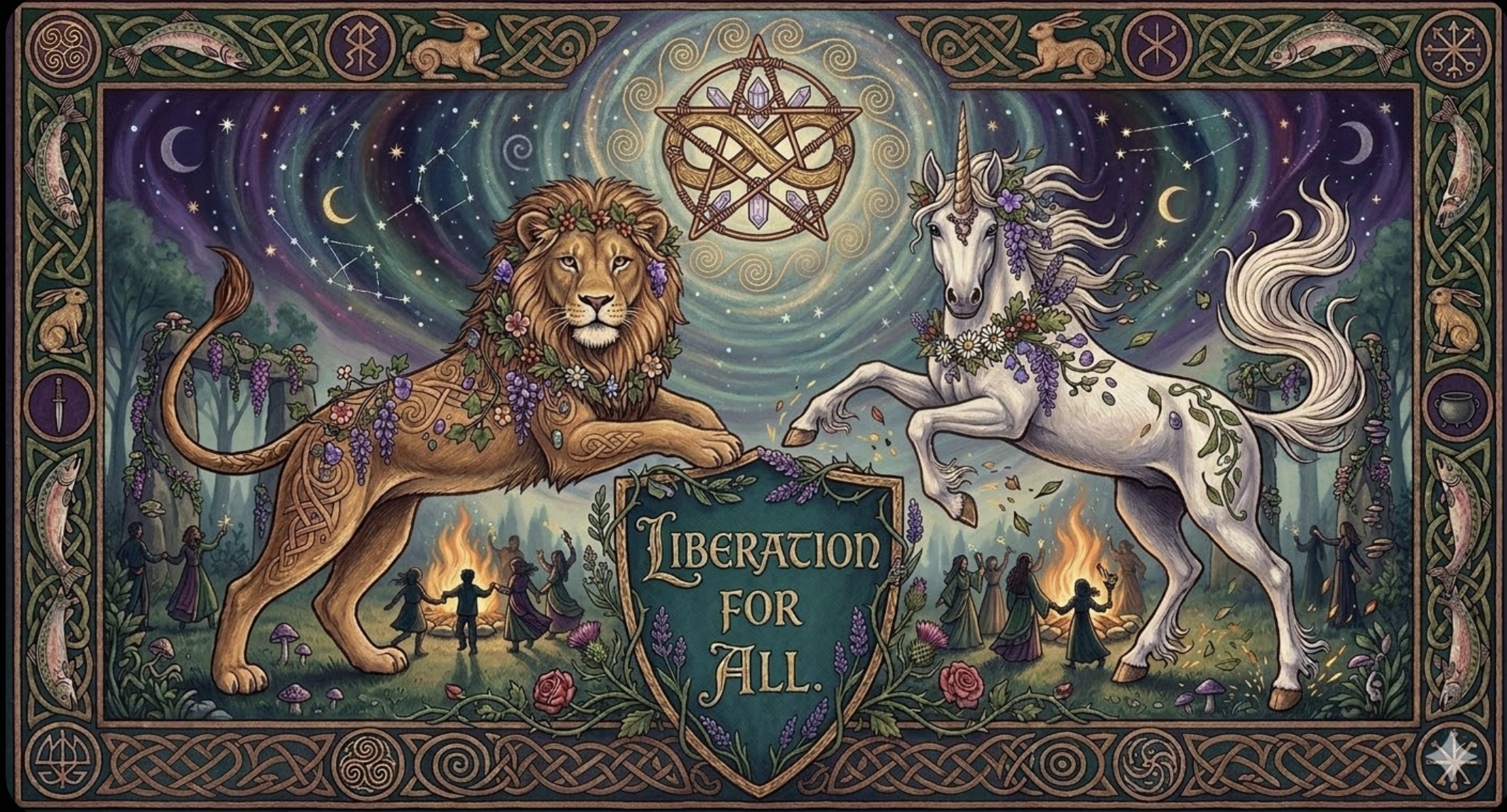 “It is the british crest - the one with the chained unicorn. But the unicorn is unchained. The lion is a lioness. The aesthetic is English Magic / Pagan / Celtic. The writing on the shield says ‘Liberation for All’. They are dancing, like the Strength card in the Tarot. There’s an infinity symbol and a flower garland instead of a crown. It’s feminine, and femme. Inclusive and ritualistic. Ancient and contemporary. thanks.”